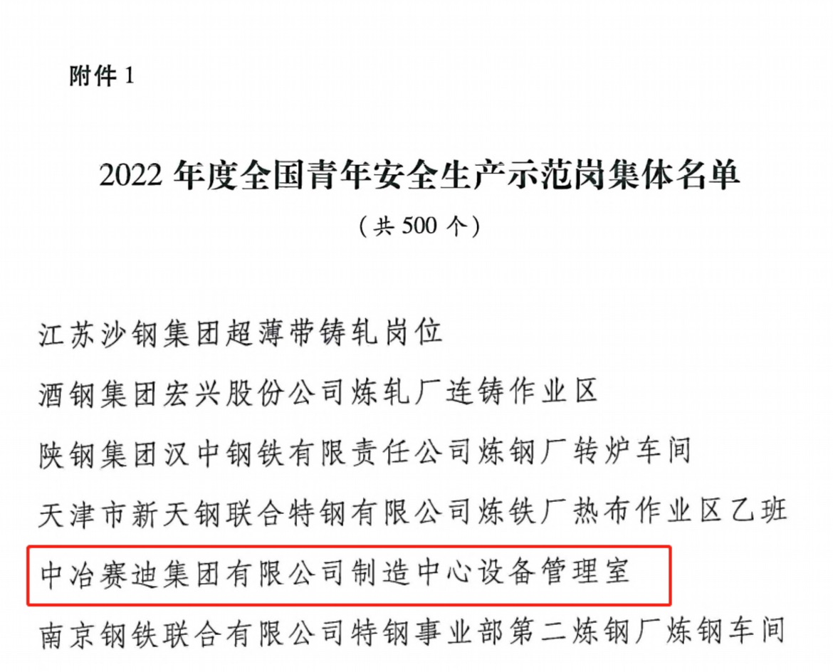 近日,根據(jù)共青團(tuán)中央辦公廳、應(yīng)急管理部辦公廳《關(guān)于認(rèn)定2022年度全國青年安全生產(chǎn)示范崗和開展2023年度創(chuàng)建活動的通知》,中冶賽迪制造中心設(shè)備管理室被共青團(tuán)中央、應(yīng)急管理部認(rèn)定為2022年度全國青年安全生產(chǎn)示范崗。之前該集體先后榮獲2020年重慶市“青年安全示范崗”、2020年全國鋼鐵行業(yè)“全鋼青年安全生產(chǎn)示范崗”、2019年裝備公司“安全生產(chǎn)先進(jìn)集體”等榮譽(yù)。